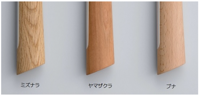| ミズナラ | はっきりした木目と凹凸が手に馴染む。家具・ウイスキー樽にも使われる高級材。 |